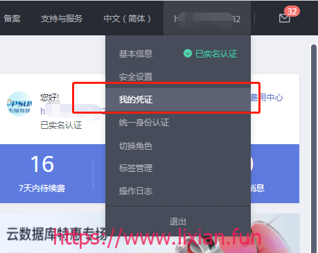 (2)单击页面右上角的用户名,并选择“我的凭证”。